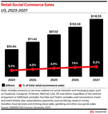 *We define social commerce as the sale of products or services ordered by buying directly on a social platform, or through clicking links on a social network that lead to the retailer’s product page with an immediate purchase option. As with all our retail metrics, we exclude things like travel and event tickets and the purchase of vice goods.