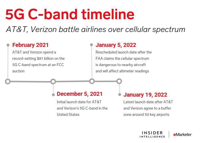 - Airlines requested that 5G not be implemented within 2 miles of key US airport runways and called for “immediate intervention” to block AT&T and Verizon’s 5G C-band rollout slated for today.