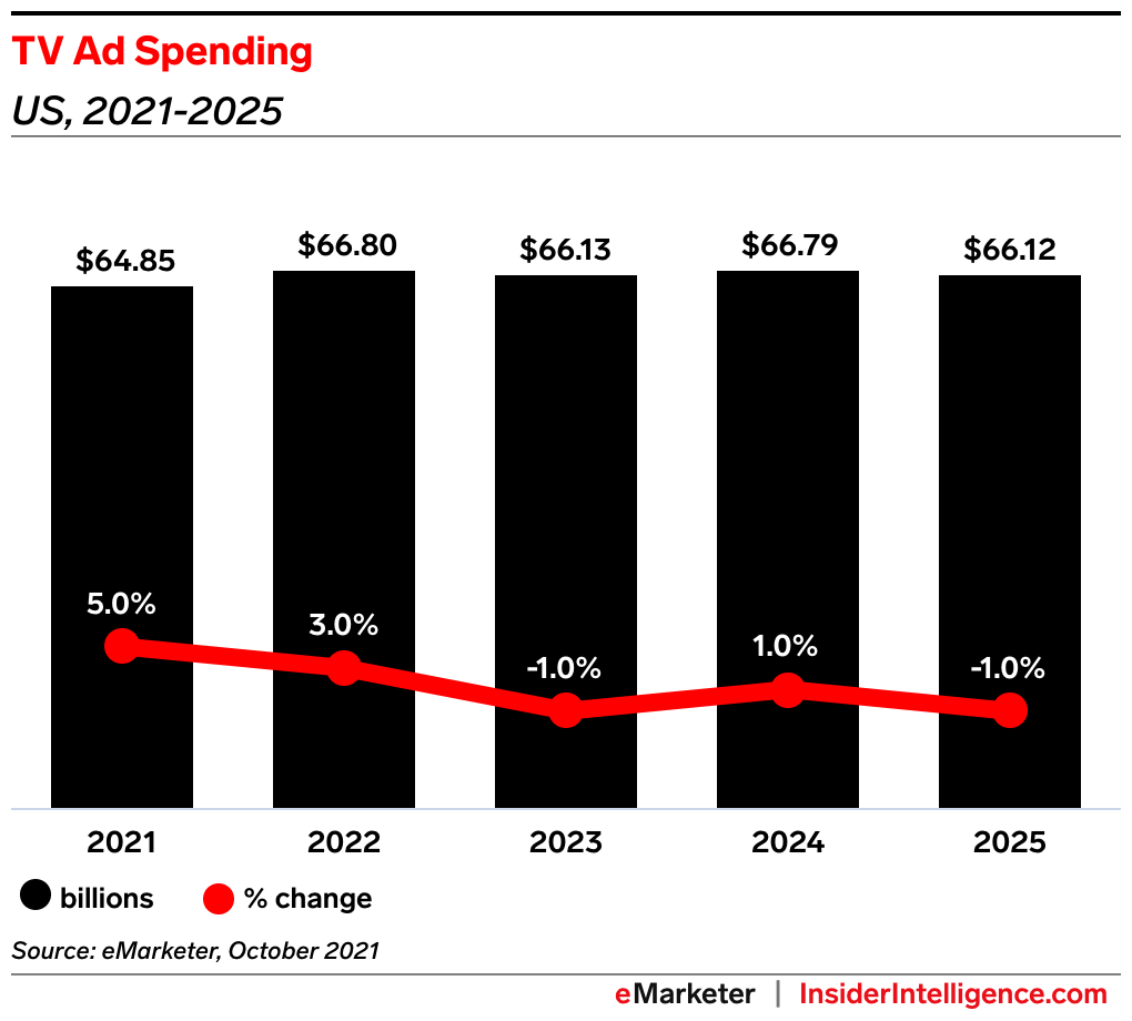 - We expect CTV ad spending to rise 32.3% this year, per our forecast—versus a paltry 3.0% rise for standard linear broadcast and cable. In 2022, linear TV ad spending will be about 3.5 times that of CTV ad spending; by 2025, it will fall to just 1.9 times that of CTV ad spend.