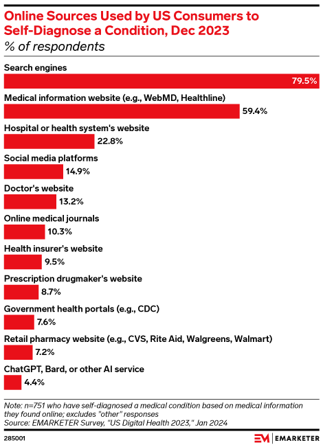 Key Stat: More than half (54%) of US consumers have self-diagnosed a medical condition based on information obtained online. Search engines and medical information websites are most commonly used to arrive at those self-diagnoses.