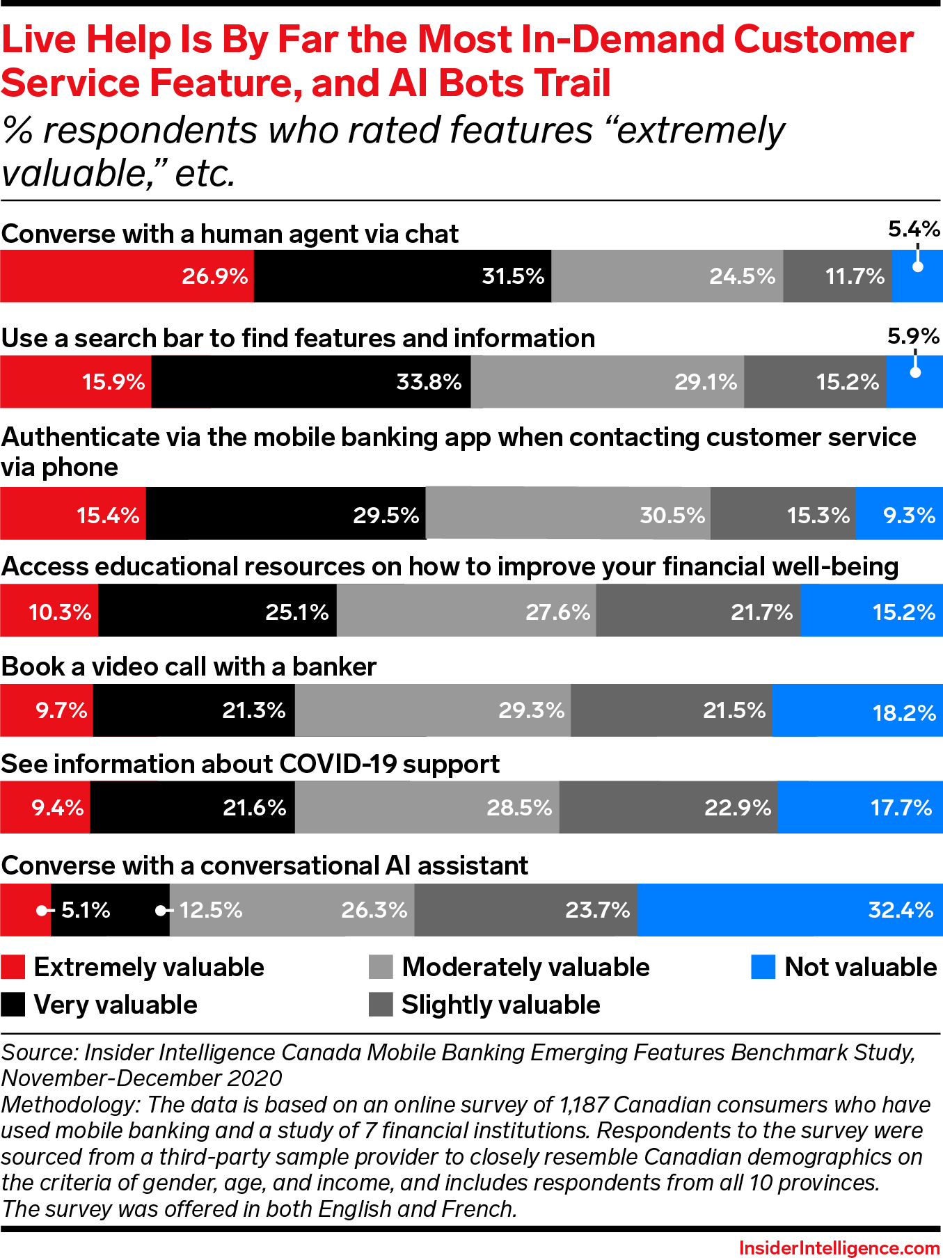 But mobile banking users may not be convinced of customer service tools’ enduring value: Respondents to Insider Intelligence’s Canada Mobile Banking Emerging Features Benchmark 2021 ranked Customer Service as the least valuable among the study’s six categories. To persuade users to more strongly embrace mobile customer service tools, banks should focus on the most popular features in this category.