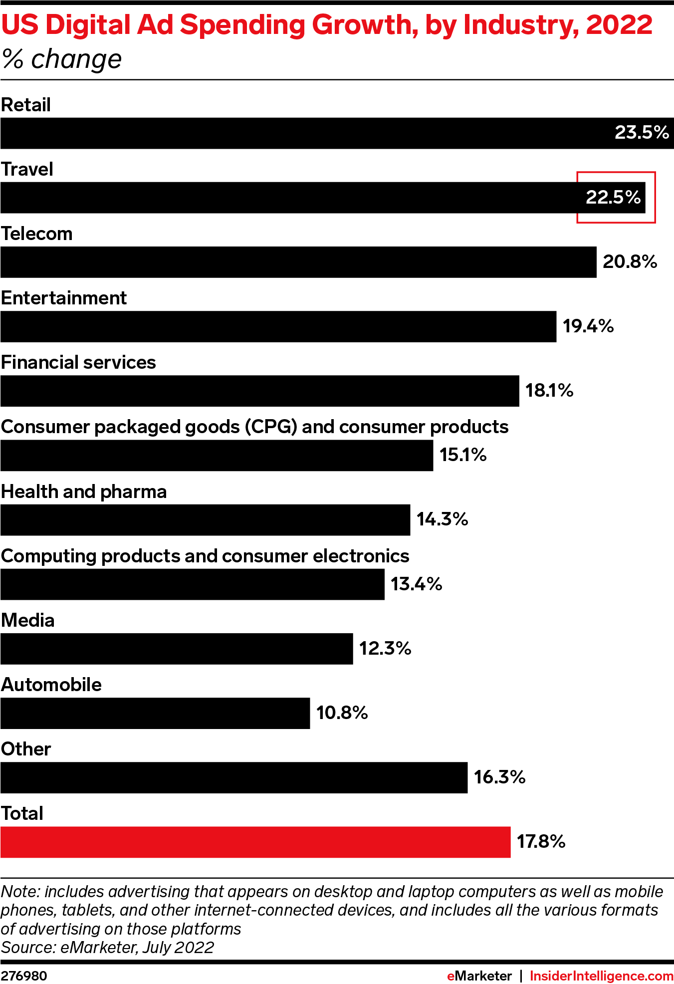 Nonetheless, travel’s pace of increase will nearly lead the pack this year, before rising to the forefront next year. Only the retail industry is expected to increase its spending more quickly than travel in 2022. By next year, travel will be the only cohort growing its spend by at least 20.0%.