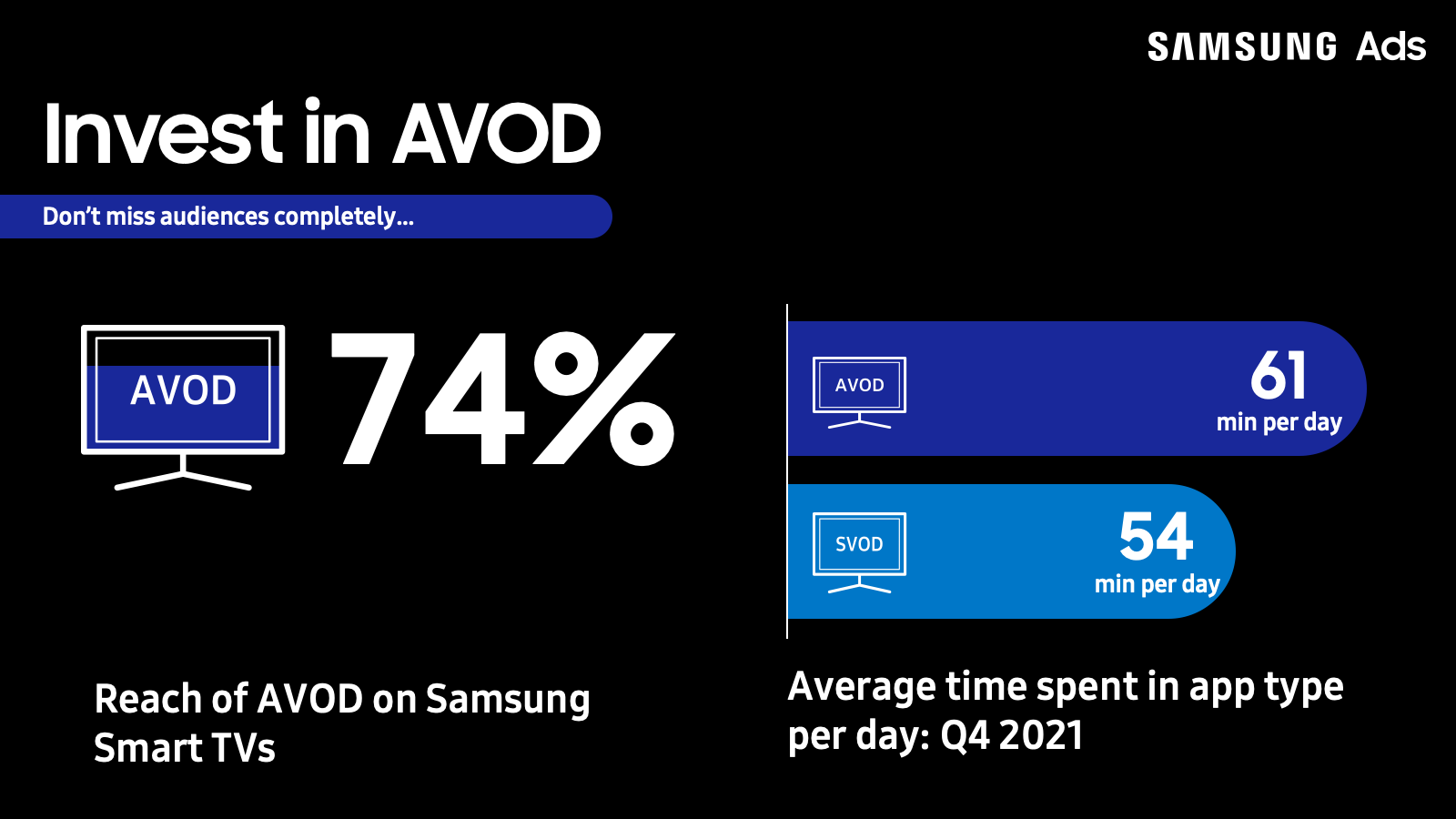 How to avoid it: The solution is to buy AVOD broadly. The apps and aggregators associated with broadcast and cable TV networks, represent just 36% of all time spent in AVOD, according to Samsung Ads data. Without expanding your AVOD buy, you encounter further reach and frequency issues. Buy broadly into free ad-supported streaming TV (FASTs), and streaming apps—including non-broadcast and cable networks, music, and social video—to reach that other 64% of time spent.