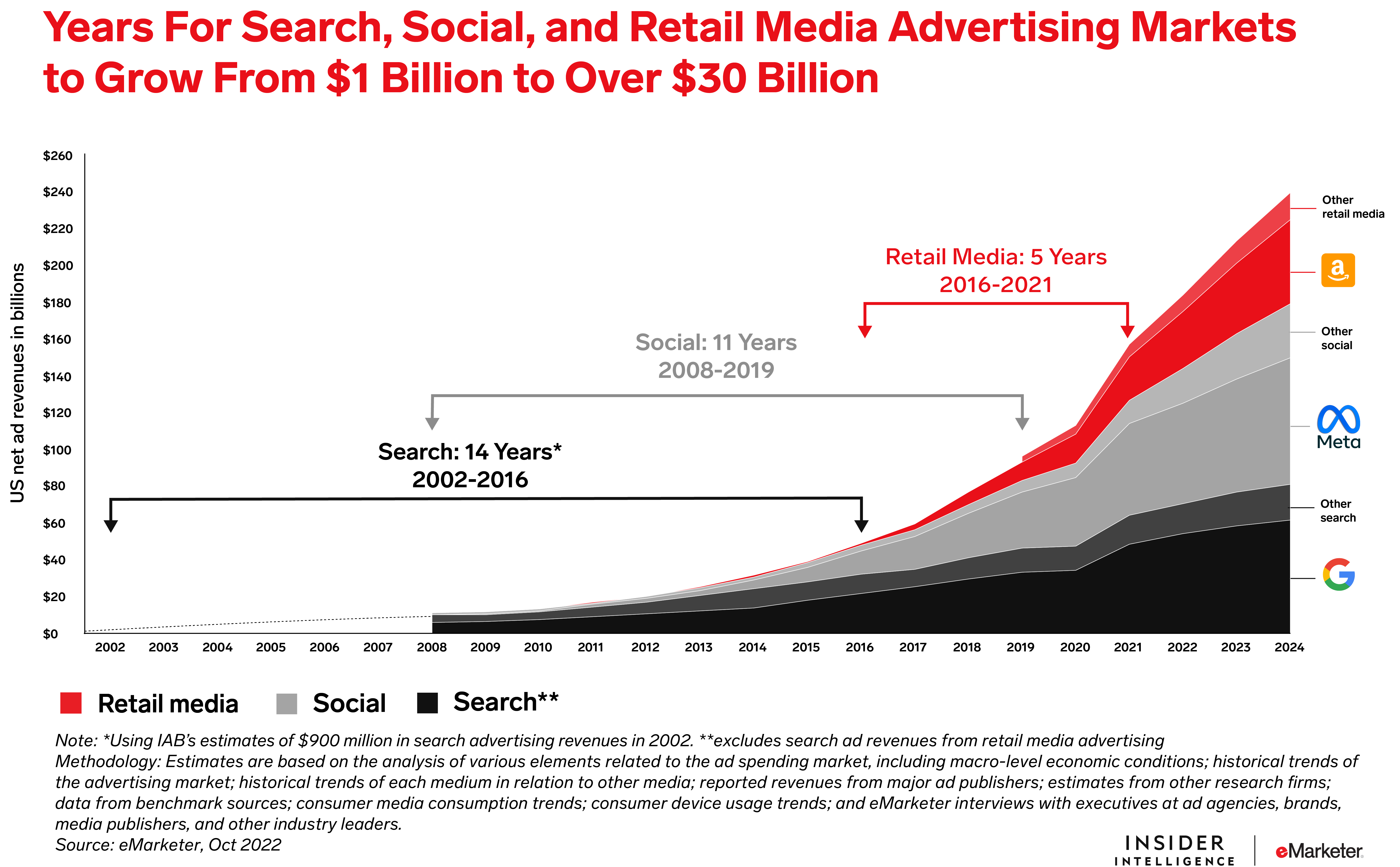 The numbers: Insider Intelligence has described retail media as the third big wave of digital advertising. A look at the rise of retail media shows just how quickly this new type of platform emerged, particularly when compared to the prior two waves: