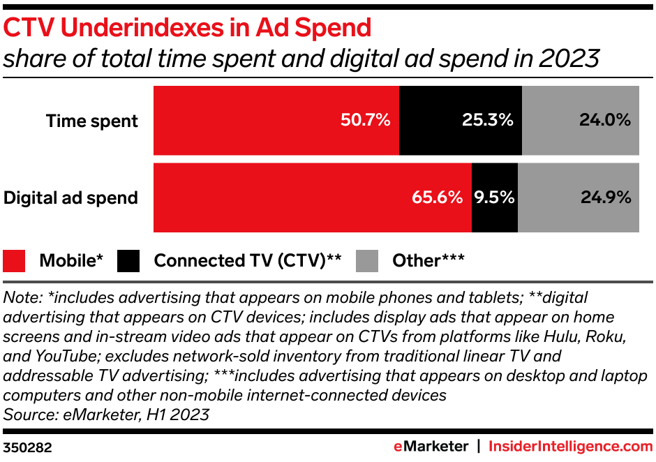 Over a quarter of digital time is spent with a CTV, but less than 10% of US digital ad dollars flow into CTV.