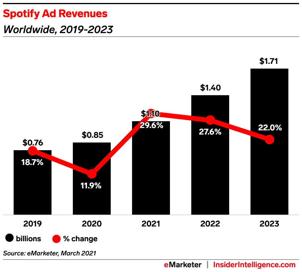 - We estimate that Spotify’s worldwide ad revenues will increase by 29.6% this year, to reach $1.10 billion.