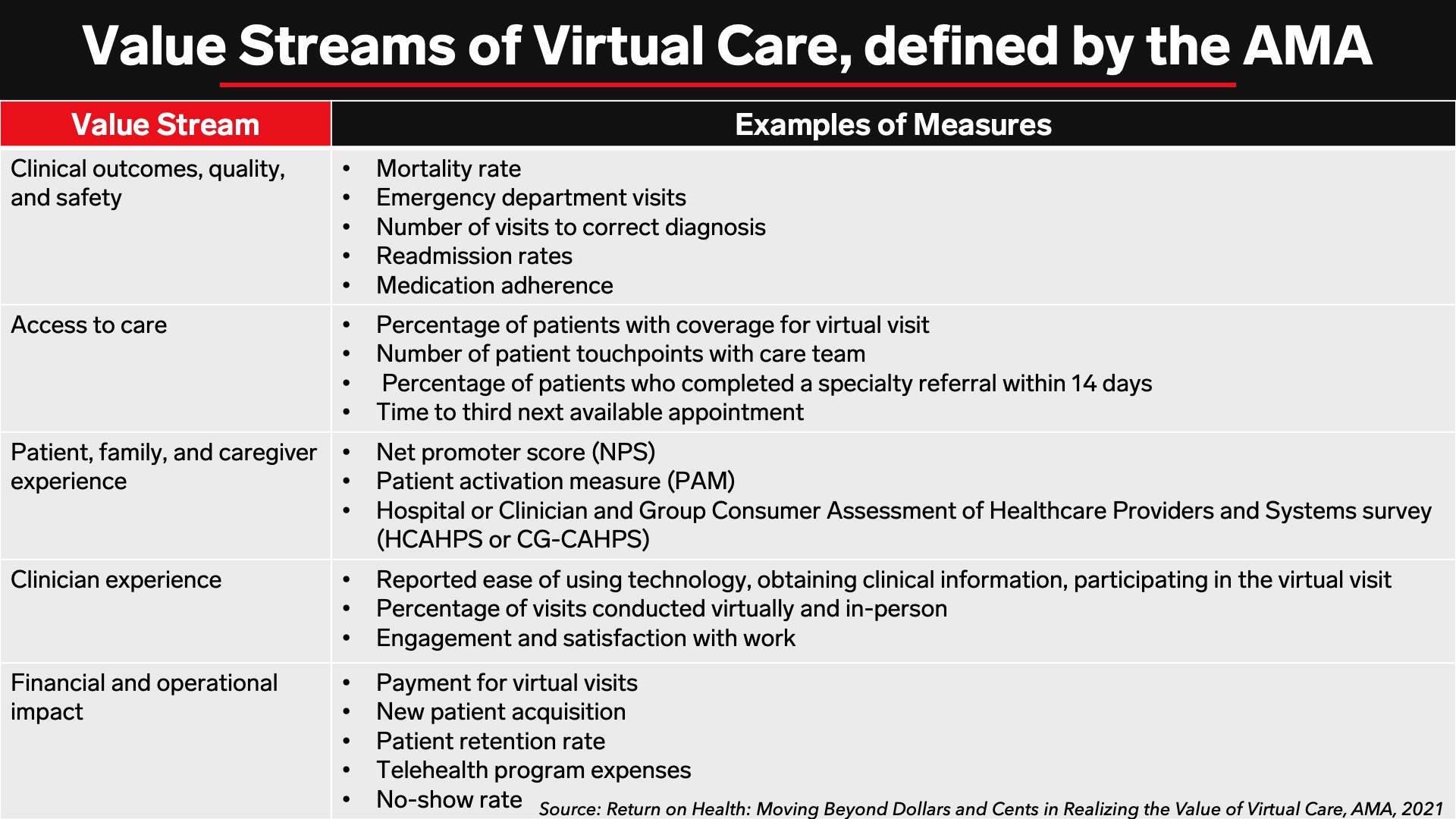 The American Medical Association (AMA) released a new framework for measuring how telehealth can provide ROI for healthcare organizations, all while producing positive patient outcomes. While the focus around virtual care has largely been short-term financial measures amid the pandemic, virtual care also comes with long-term effects, like the ability to dramatically iron out existing wrinkles in the US healthcare system (e.g., improving clinical outcomes, operational inefficiencies, and health equity).