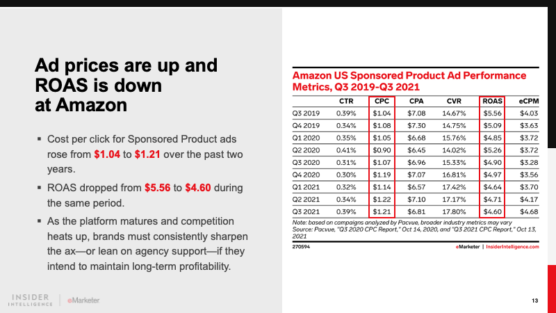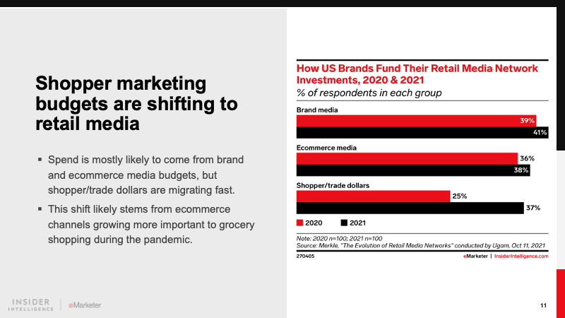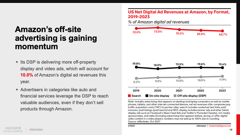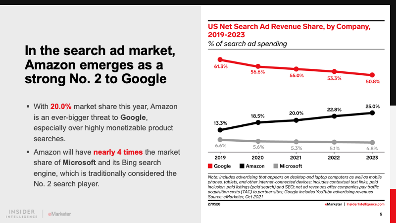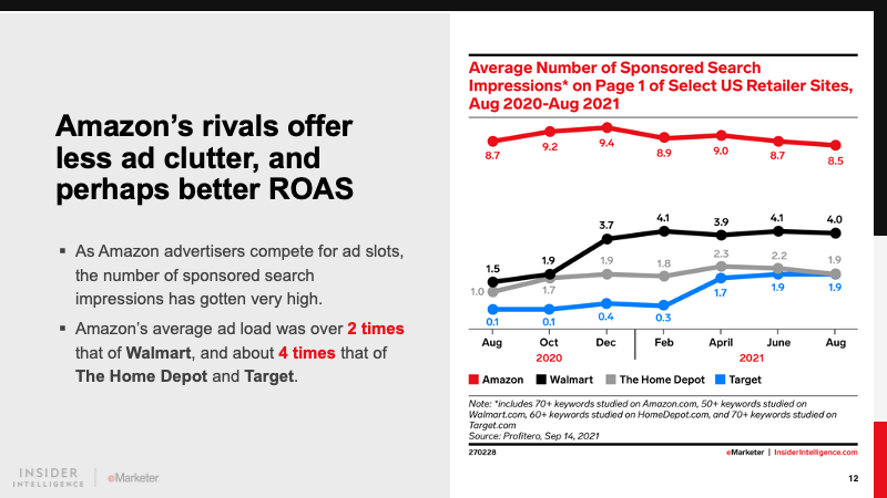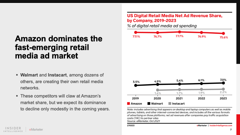 It is the dominant player in retail media and will account for 77.7% of the market in 2021. The ecommerce giant’s realization of this high-margin incremental revenue stream has driven other retailers to follow suit. Differentiated offerings from Walmart, Instacart, and others will keep Amazon on its toes.