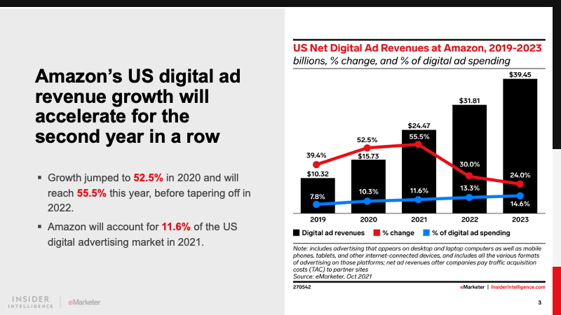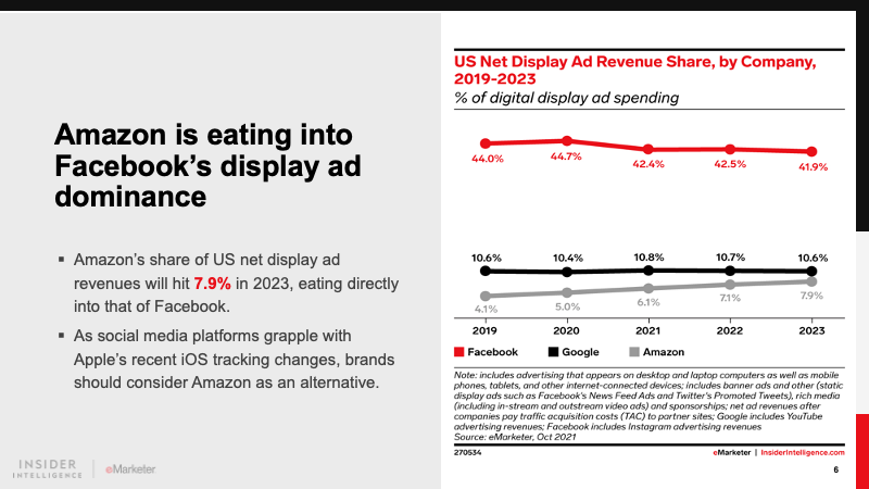 Amazon’s US digital ad revenues will reach $24.47 billion in 2021, rising 55.5% over the prior year and representing 11.6% of the digital advertising market. We expect it to account for 14.6% of the market in 2023 as it narrows the gap with Google and Facebook.