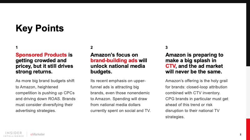 Amazon will attract more brand investment through product innovation, improved metrics for brand and sales performance, and expansion into other ad formats. It will also need to build out its brick-and-mortar footprint—particularly in the grocery and department store segments—to maintain its leadership in first-party data.