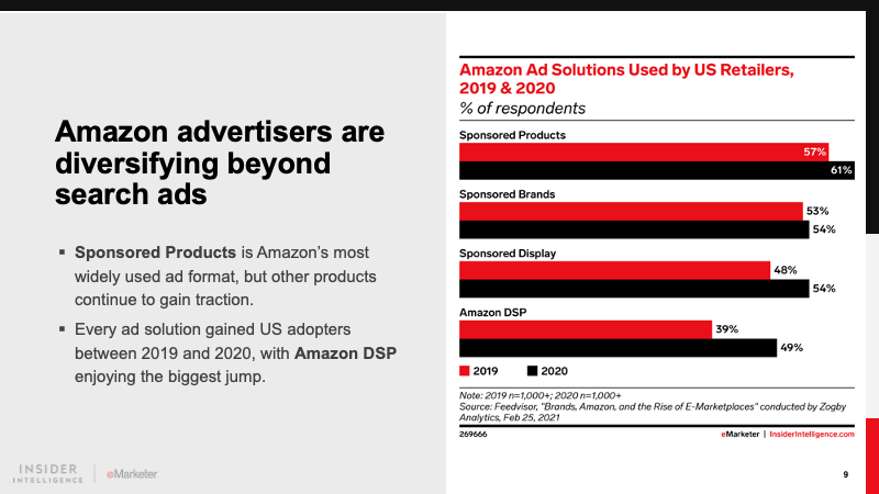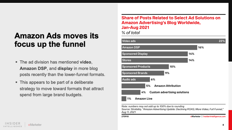 Amazon’s base of advertisers will expand beyond its core of small and medium-sized businesses (SMBs) on its marketplace. Large multinational brands will invest more in sponsored search and brand-building ads, while advertiser categories nonendemic to Amazon, such as financial services, will focus on offerings through Amazon DSP and streaming TV ads.