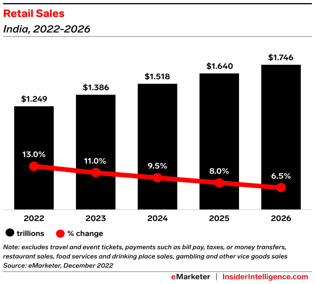 Why India? We expect the retail market in India to grow 11% to $1.39 trillion this year, per our forecast. That’s strong enough growth to make India the fastest-growing retail market in the world, which we expect it to remain through 2026.