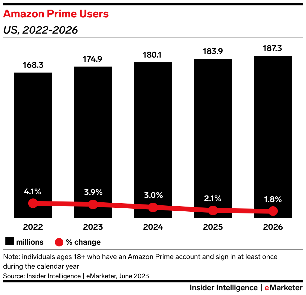 - The number of Prime users will grow just 3.9% this year and slow to 1.8% by 2026, according to our forecast.