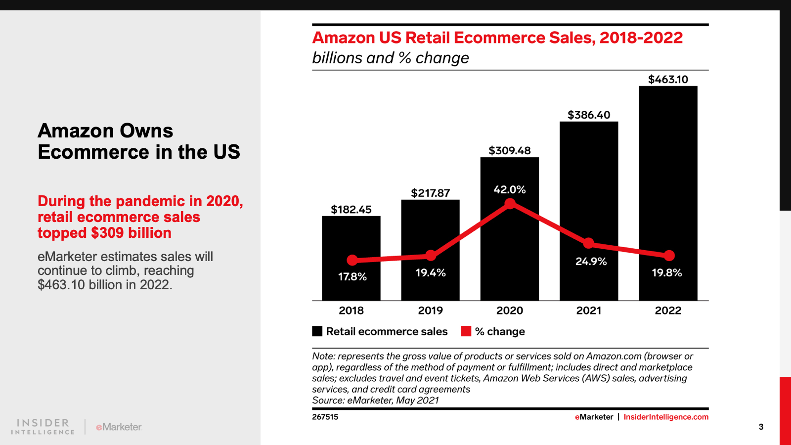 Amazon US Retail Ecommerce Sales, 2018-2022 (billions and % change)