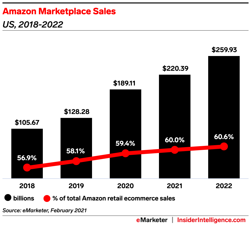 Key stat: Amazon’s third-party marketplace will make up 60.0% of its US ecommerce sales this year, or $220.39 billion, per our estimates. And because Amazon’s market share is so large, its third-party marketplace alone makes up nearly a quarter (24.3%) of total US retail ecommerce sales. We expect both its sales and share of the market to keep growing next year.