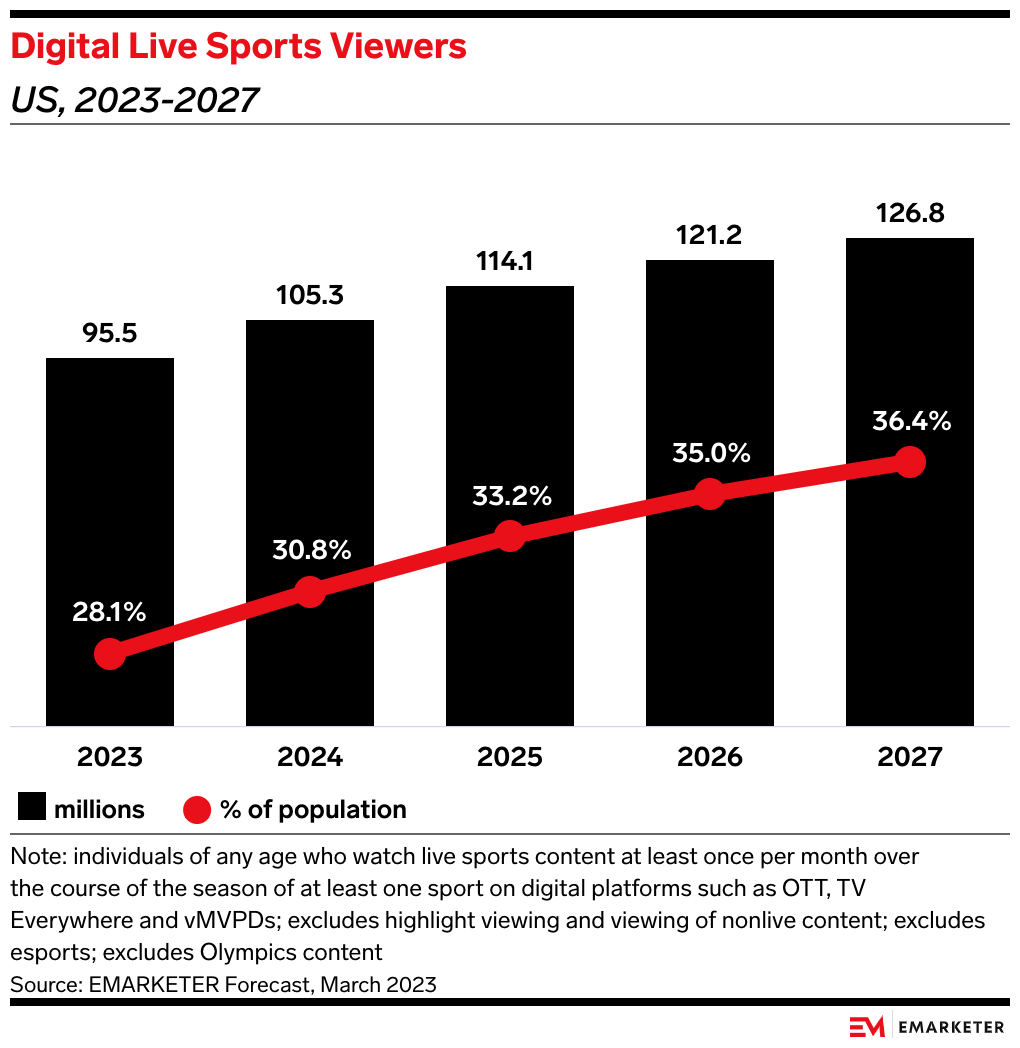 - Our forecast calls for digital live sports viewers in the US to grow from 95.5 million in 2023 to 126.8 million by 2027—a 32.8% increase over four years.