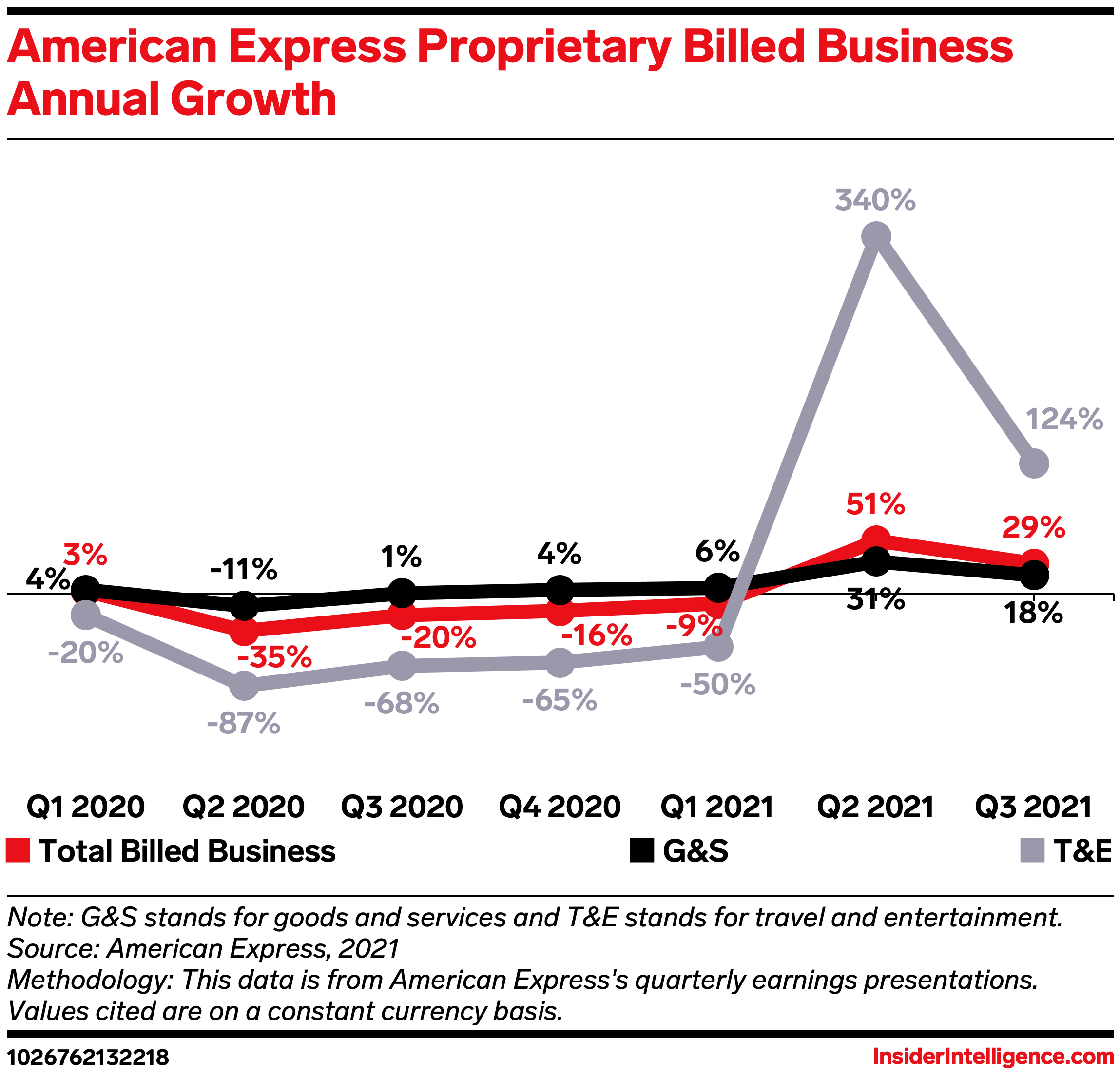 - Within billed business, travel and entertainment (T&E) volume skyrocketed 124% YoY but declined 29% Yo2Y.