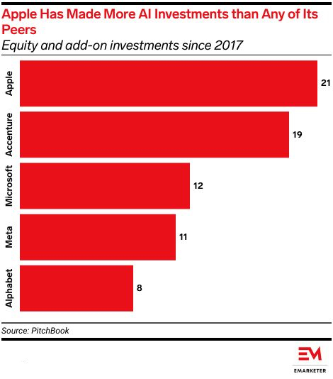- The company has acquired various AI startups. It wants to develop hardware for its own AI data centers and has featured AI potential in its marketing for new MacBooks and iPads.