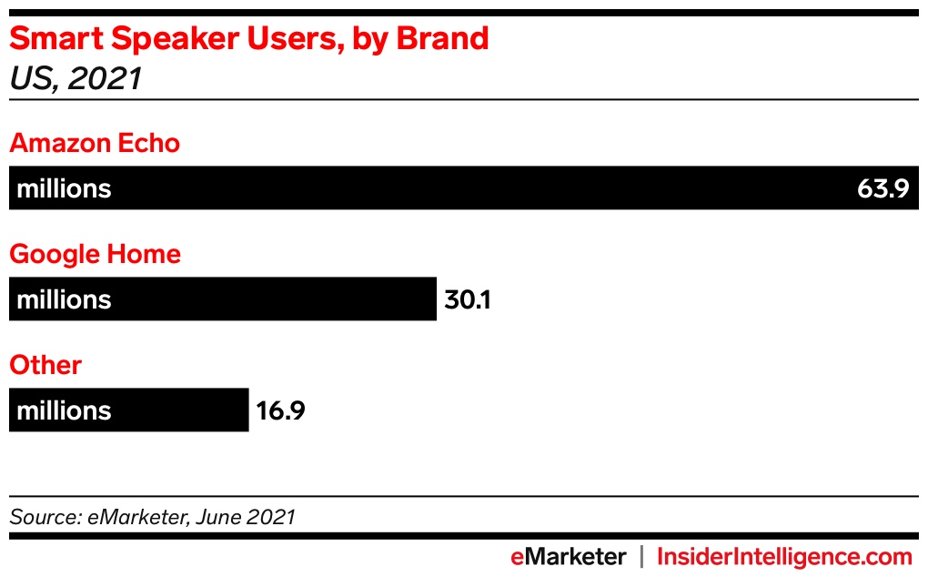 - A report from CIRP in August said the US smart speaker market hit 126 million devices as of June 2021, with Amazon owning the lion’s share of the market at 69% and Google coming in second at a 20% share.