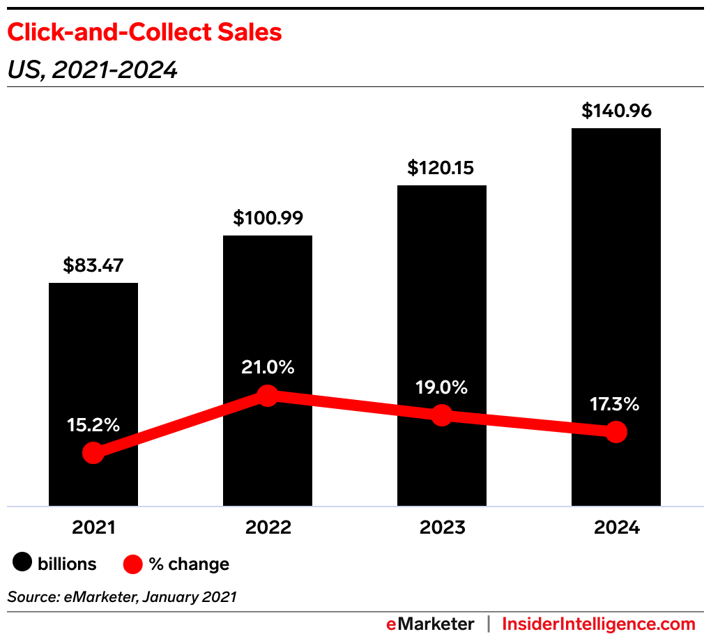 Who might benefit? We estimate that click-and-collect sales will rise 21.0% next year; tailwinds from lingering concerns about in-store visits could help propel that figure past the current projection of $100.99 billion.