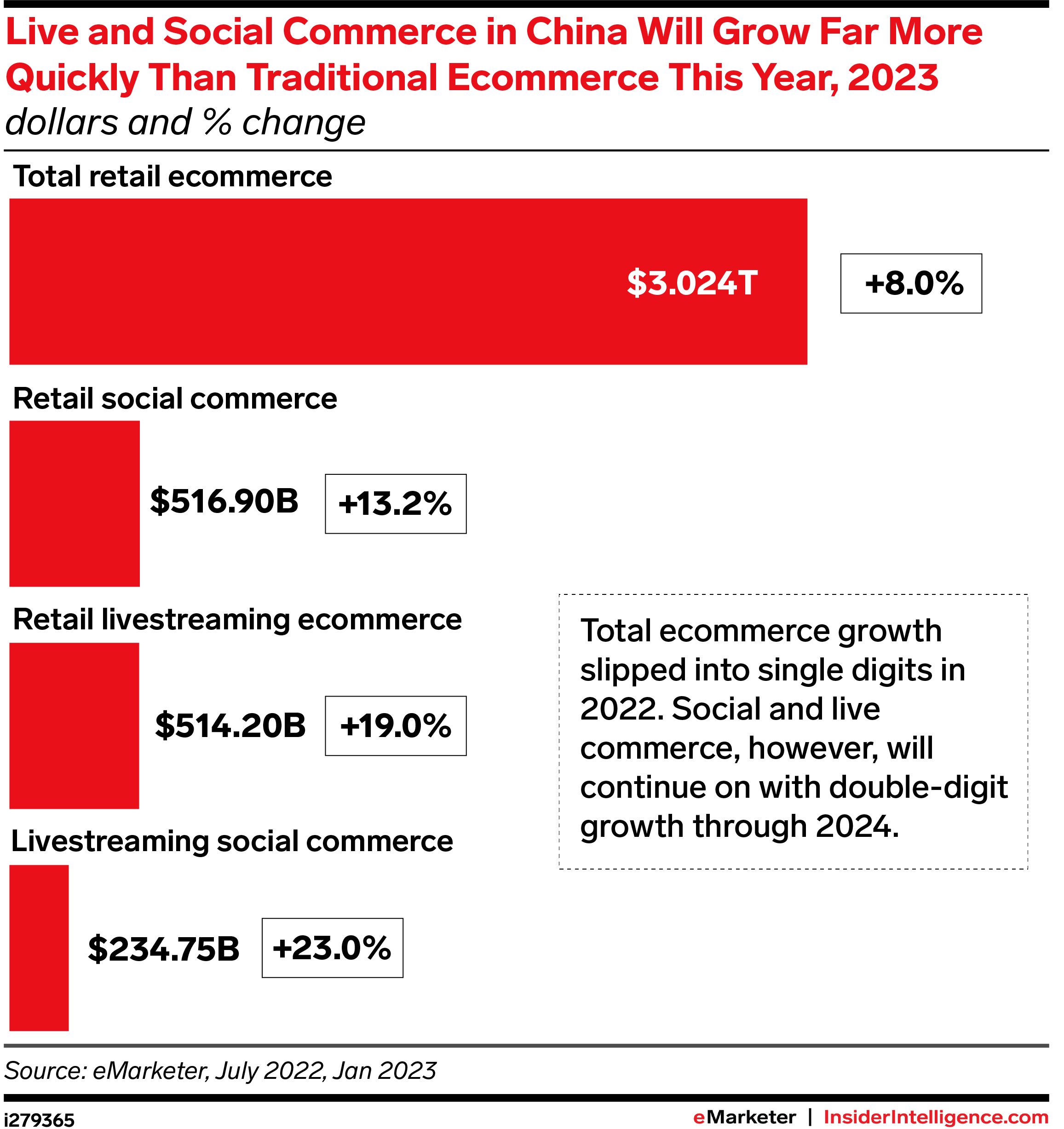 Social commerce. Though slowing, social will still outpace total ecommerce, growing 13.2% year over year (YoY). And livestreaming via social media will grow fastest of all, by 23.0%.