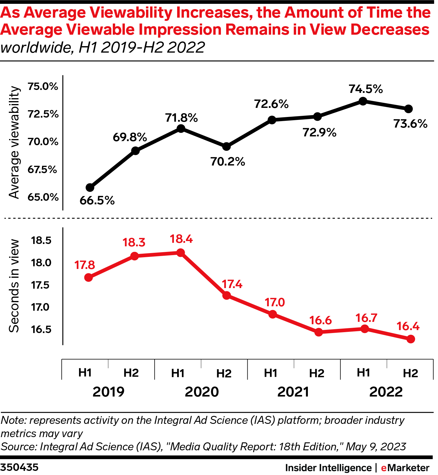 As an optimization lever and digital currency, viewability has incentivized a web full of intrusive ad clutter. More than a fifth (21%) of observed ad impressions run on MFA websites that game viewability, according to a January 2023 study from the Association of National Advertisers (ANA). MFA websites often resort to high ad density, pop-ups, autoplays, and frequent ad refreshing to generate revenues. But these high-viewability placements are training consumers to ignore the ads they see. And as average global viewability trends upward, consumers are spending less time viewing each ad, according to H2 2022 data from Integral Ad Science (IAS).