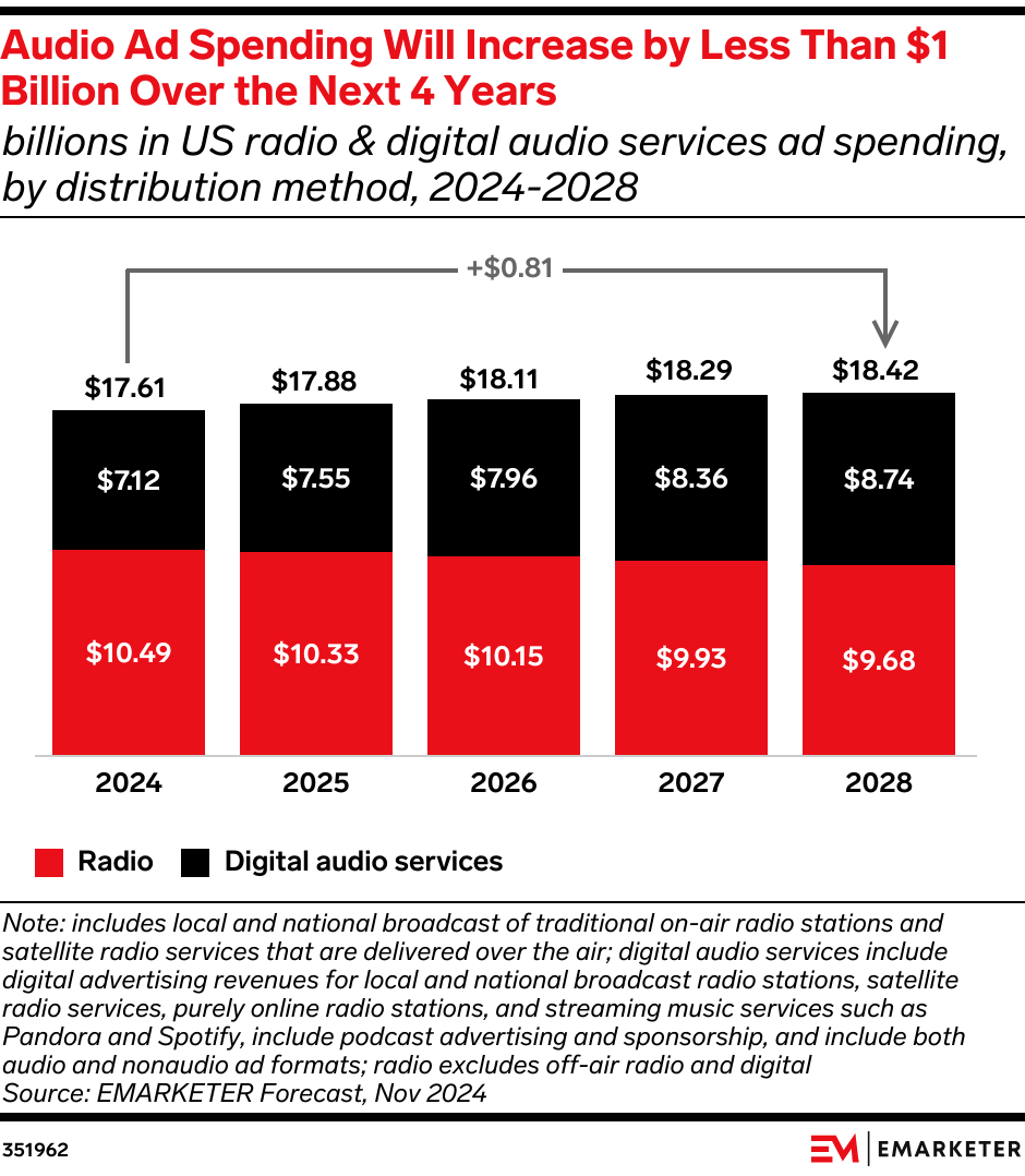 Key Stat: Spending on digital audio ads will rise $1.62 billion between 2024 and 2028, per our forecast. But total audio ad spending will grow by less than $1 billion during that period.