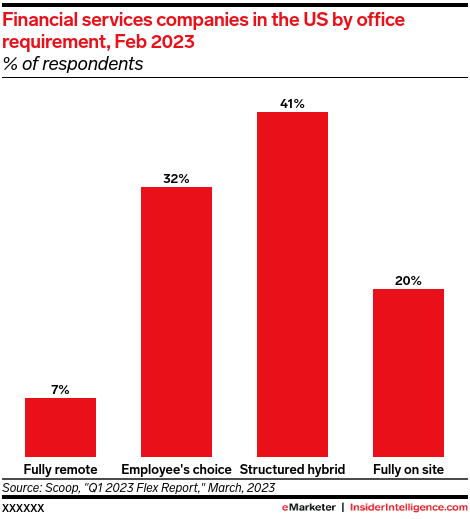 The trend: Despite some banks’ efforts to get staff back into the office, just 20% of US financial services companies require fully on site work, according to hybrid working specialist Scoop.