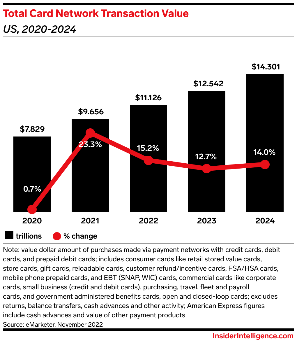 By the numbers: Bank of America’s total payment volume hit $1.1 trillion in Q1 2023, per its earnings presentation—a 9% year-over-year (YoY) increase. Growth slowed from 14% YoY in Q1 2022.