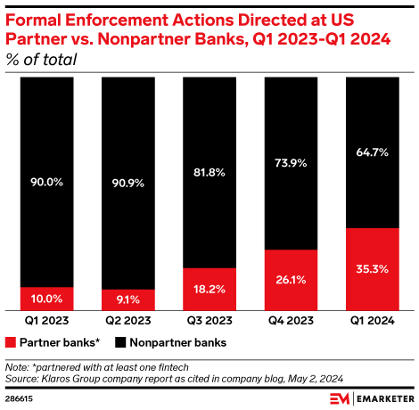 Key Stat: Banks partnered with at least one fintech are a growing target for negative regulatory attention. In Q1 2024, 35.3% of partner banks got a formal enforcement action, up from just 10.0% the year prior, per Klaros Group. This illustrates the challenge banks face in keeping their banking as a service (BaaS) operations compliant.