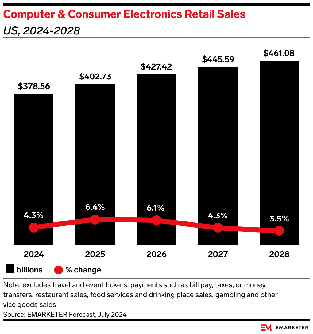 - However, we expect computer and electronics sales to accelerate throughout the second half of the year. Our forecast expects sales in the category to grow 4.3% YoY—a significant gain after sales fell 3.0% YoY in 2022 and rose just 1.1% YoY last year.