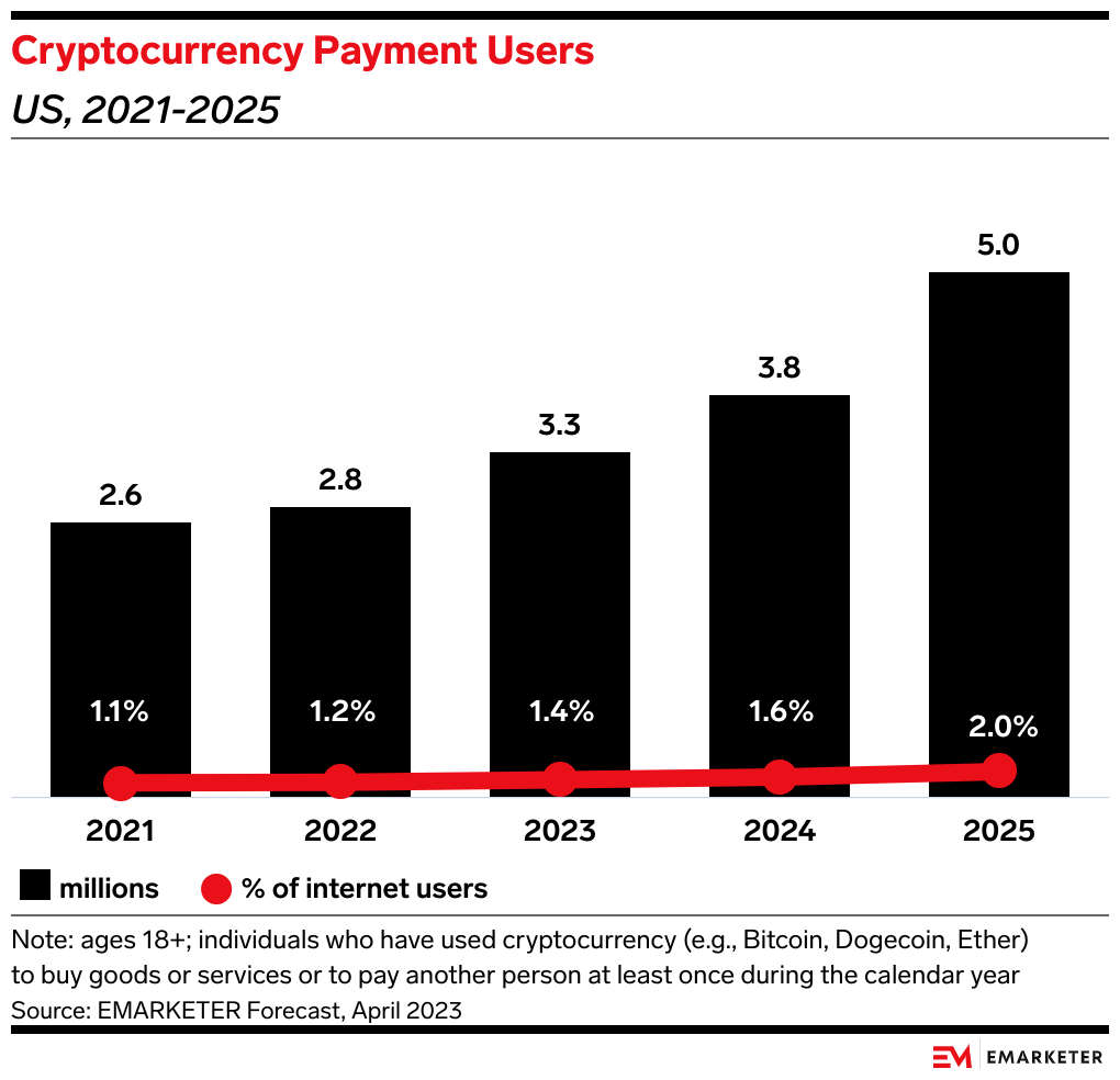 Over the next four years, we expect crypto payments will gain momentum as more providers invest in space. There’s plenty of room for growth: We forecast that only 1.6% of internet users will make a crypto payment in 2024.