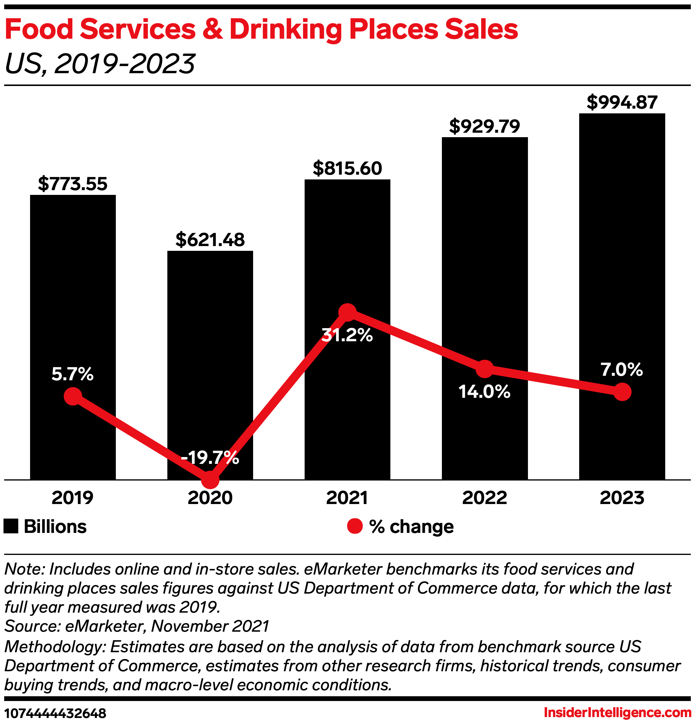 - These enhancements let Block attract more restaurant clients and capture a larger share of the hospitality market: US food services and drinking place sales are expected to grow 14% year over year in 2022 and hit $929.79 billion, per Insider Intelligence forecasts.