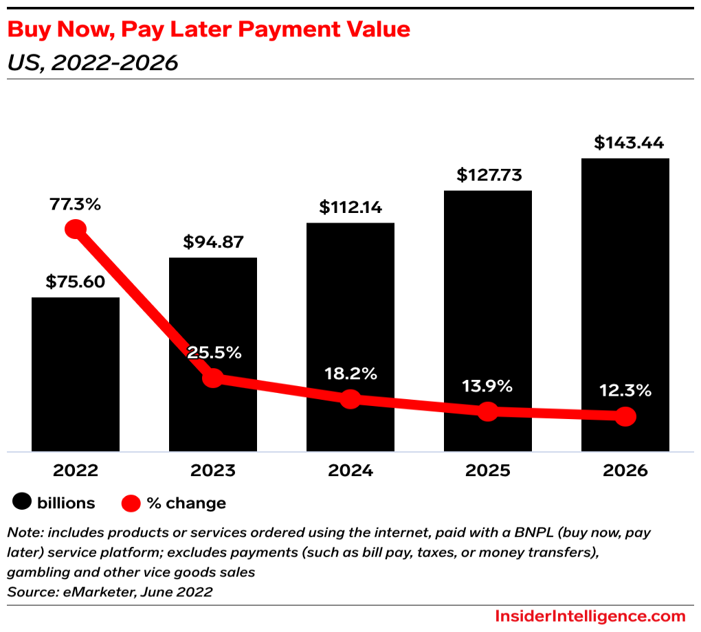 Our take: The popularity of buy now, pay later (BNPL) kept growing in 2022 as consumers sought out more flexible payment methods, merchant acceptance grew, and BNPL spread into new sectors. The total value of BNPL in the US increased 25.5% year over year in 2022, according to Insider Intelligence research.