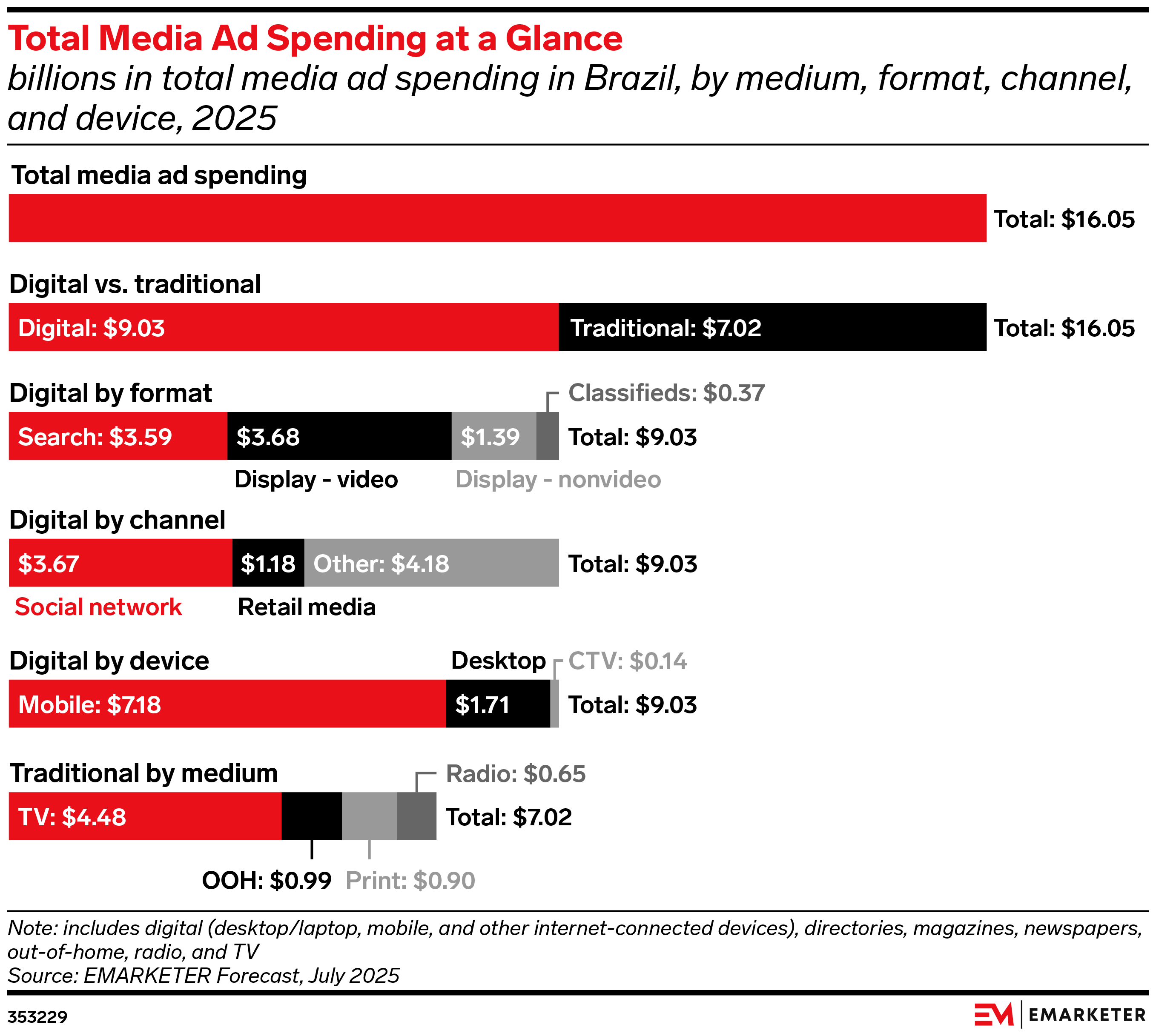 This is EMARKETER’s inaugural 2025 “Brazil Ad Spending Benchmarks.” In each edition of this series, we look at the latest forecasts for total media ad spending and digital ad spending by format, device, and channel. Each deck in this series gives marketers the data they need to benchmark their own spending.