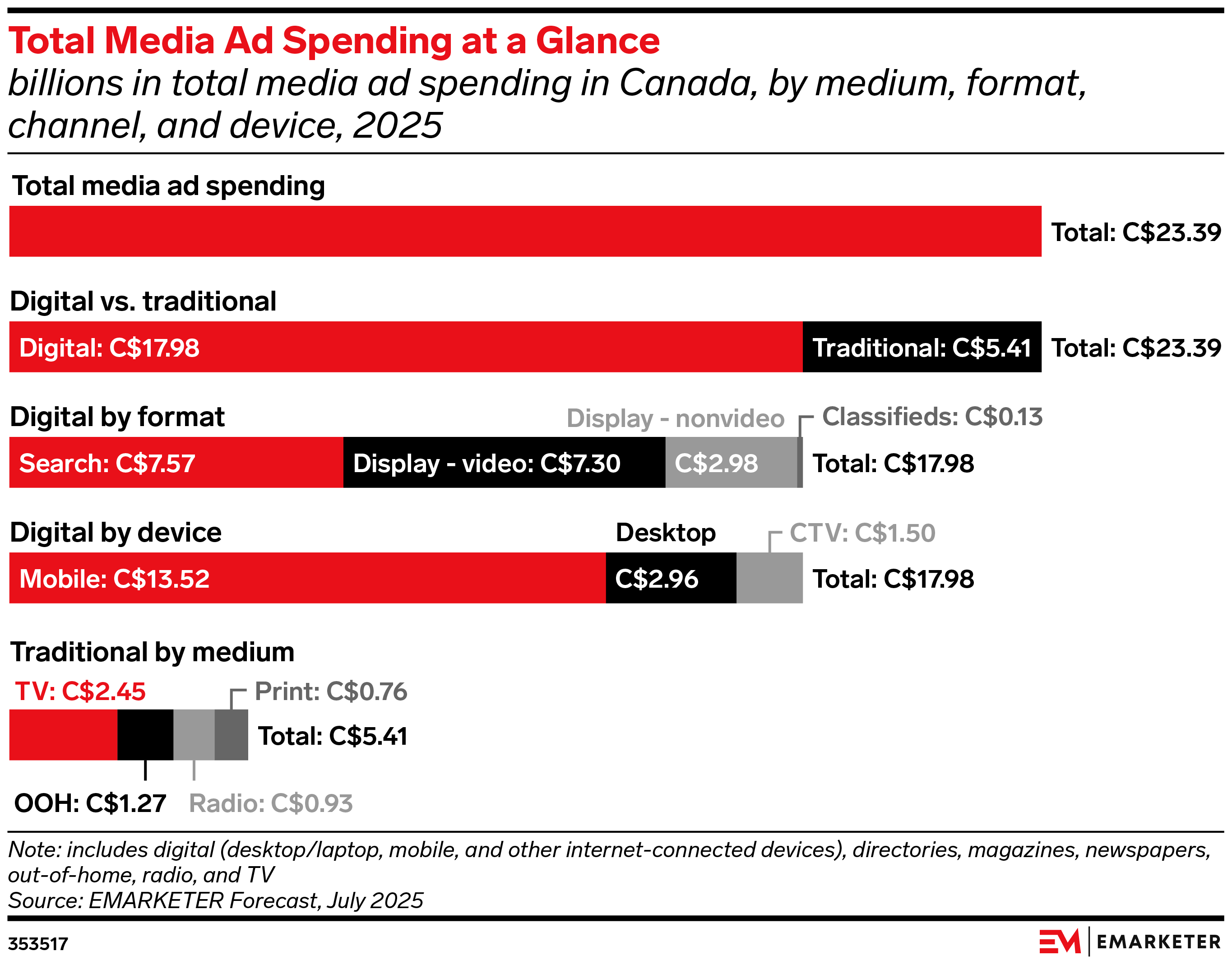This is EMARKETER’s inaugural 2025 “Canada Ad Spending Benchmarks.” In each edition of this series, we look at the latest forecasts for total media ad spending and digital ad spending by format, device, and industry. Each deck in this series gives marketers the data they need to benchmark their own spending.