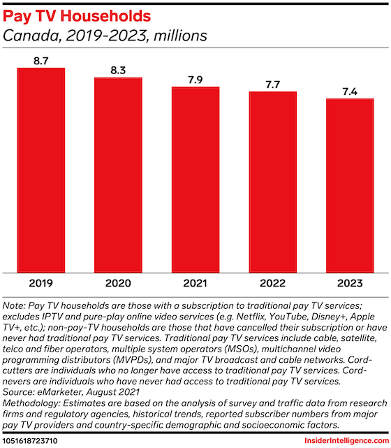 Looking ahead: Pay TV households will continue to decline in Canada. By 2025, we predict that just 7.0 million households will maintain pay TV subscriptions, a total share of 43.1% of all households.