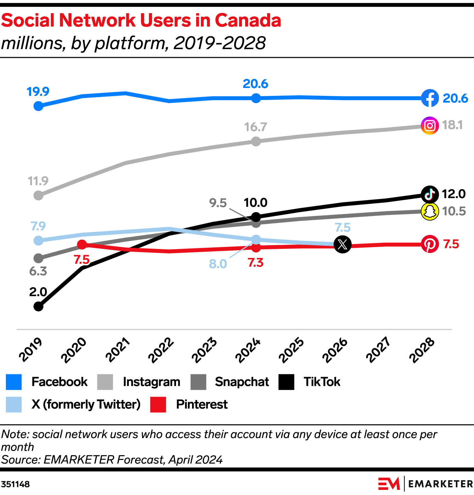 Our user forecasts for Facebook, Instagram, TikTok, Snapchat, X, and Pinterest in Canada highlight an expanding platform mix increasingly divided by age demographics.