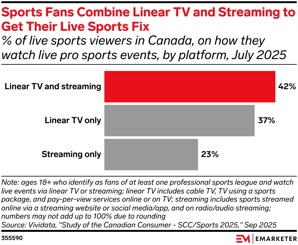 Key Stat: Some 42% of live sports viewers use both linear TV and streaming to watch games, per Vividata.