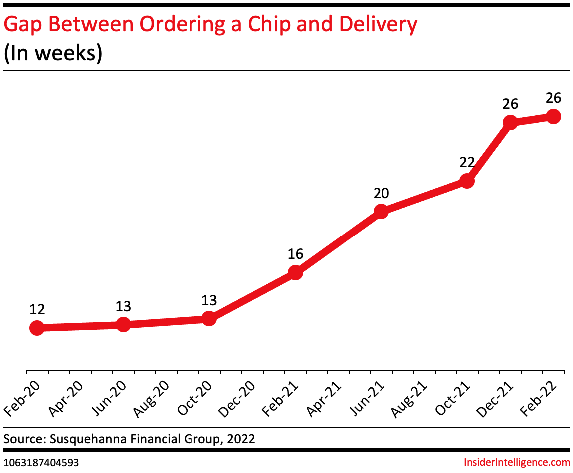 - Lockdown measures in Shanghai will further delay chip delivery times, which increased to 26.2 weeks in February, per the Susquehanna Financial Group.