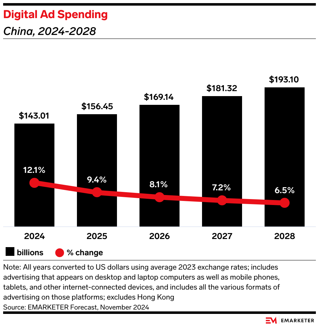 The news: Despite struggles in China’s broader economy, its digital advertising sector is projected to grow 12.1% to $143 billion this year, accounting for 85% of the country’s total media spending. This performance will push overall media expenditures up 10%, just ahead of the 9.5% expansion of the US.