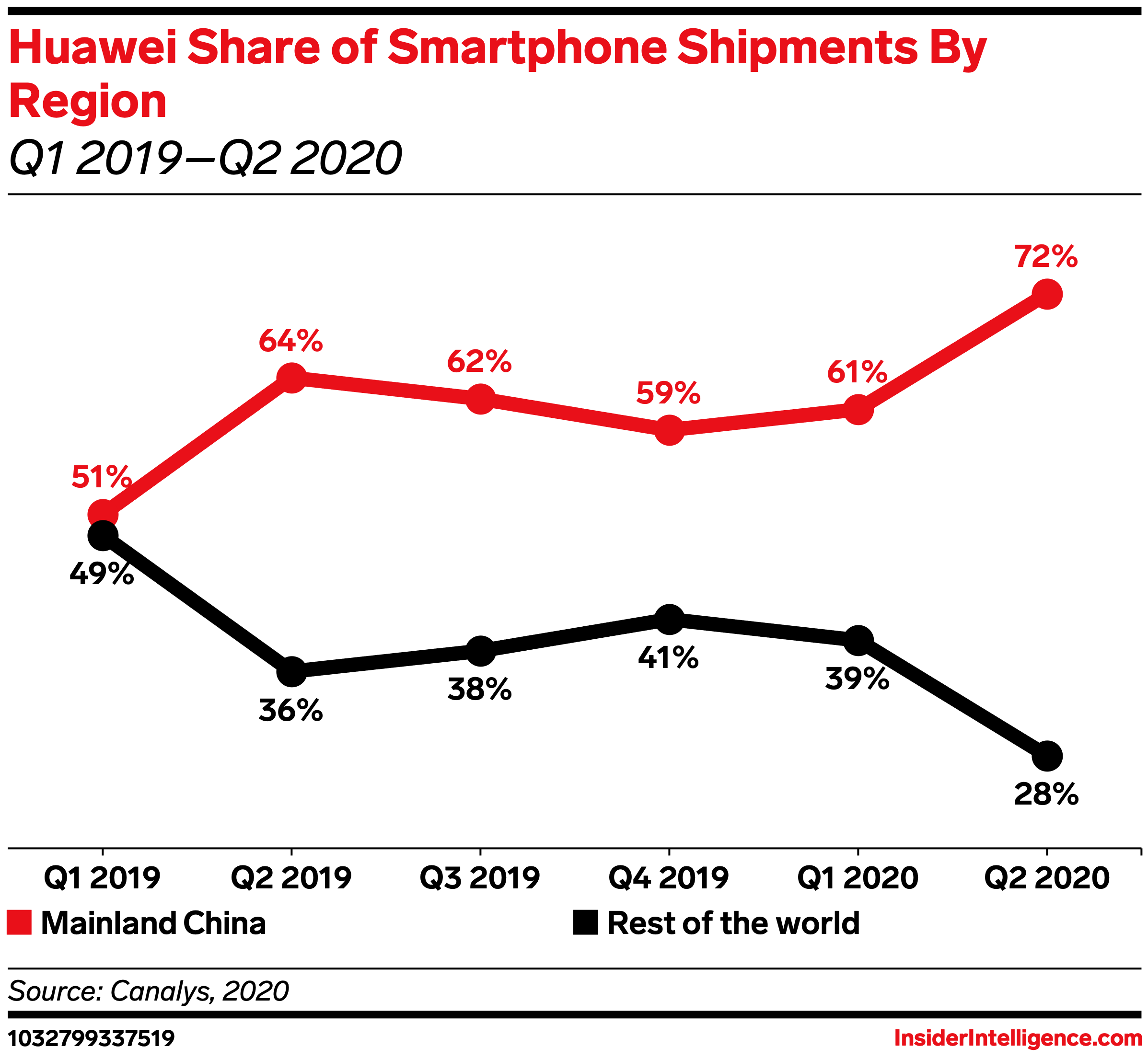 Despite the growth of its biggest market, Huawei’s performance didn’t match up with its competitors. During the quarter, Huawei shipped 13.5 million smartphones in China, a 50% decline from the prior year—while the four other top vendors experienced double-digit growth. This decline moved Huawei, previously China’s No. 1 vendor by shipments with a 41% market share in Q1 2020, to the No. 3 spot with just 16% market share. This is bad news for Huawei, which became heavily reliant on mainland China for device sales because of trade restrictions with the US and other countries.