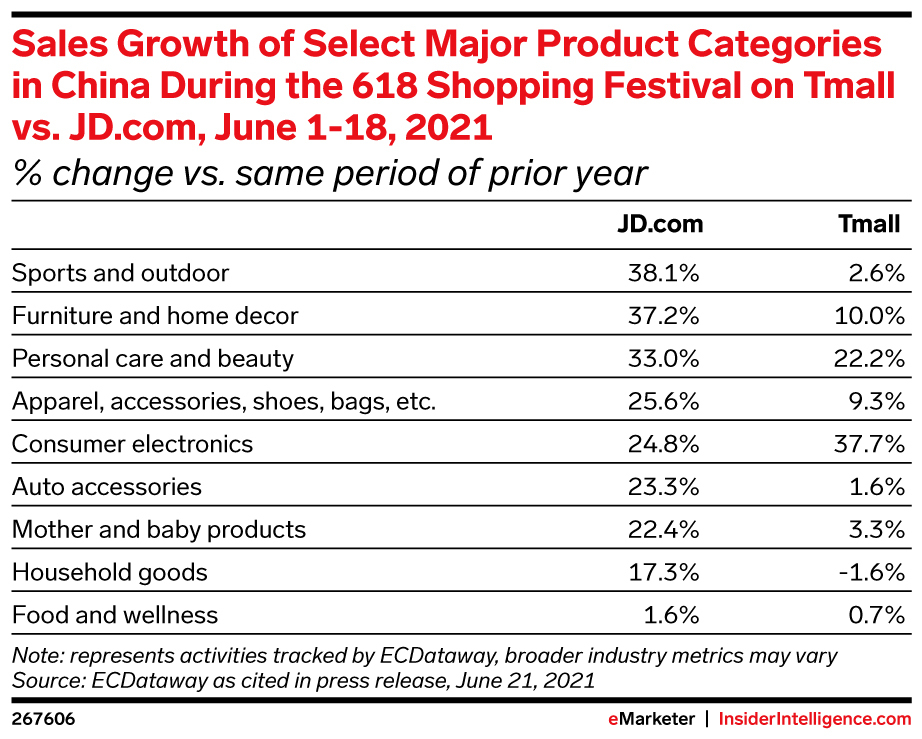 Despite these developments, traditional ecommerce players continue to lead in 618 sales. Alibaba, JD.com, and group-buying giant Pinduoduo were the top three retailers at this year’s event, according to Syntun. Consumer electronics was the fastest-growing major product category on Alibaba’s Tmall from June 1 to June 18, 2021, per ecommerce data provider ECDataway. Meanwhile, on JD.com, sports and outdoor goods posted the highest sales growth during that time frame.
