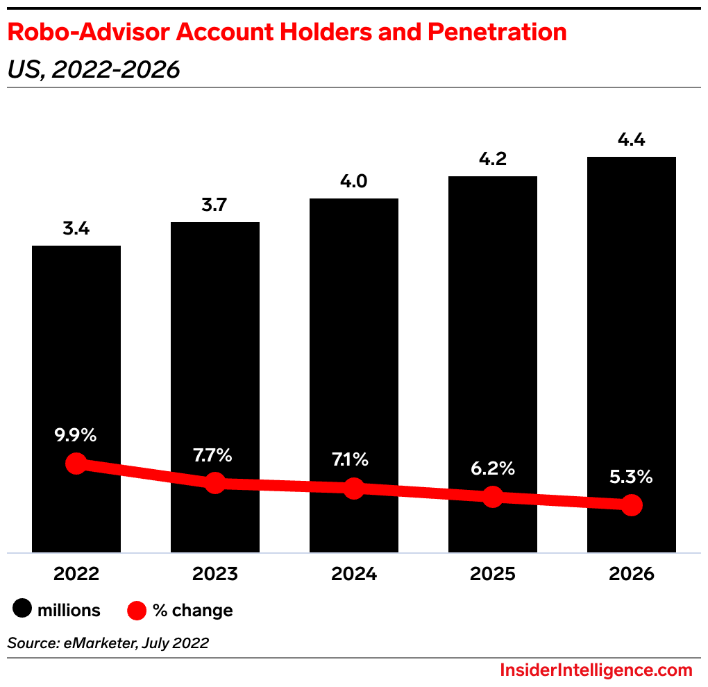 - The use of robo-advisors by investors in the US will dramatically slow over the next year, per Insider Intelligence’s forecast. Surging inflation means people have less disposable income to invest with a robo-advisor, raising concerns for Wealthfront’s growth prospects for the remainder of the year.