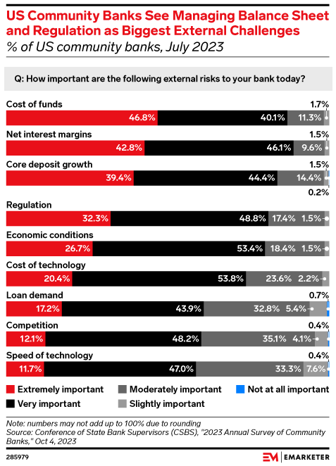 Key Stat: High interest rates can hurt growth. About 89% of banks saw the imbalance between their earnings and their payouts as an extremely or very important external risk, according to a July 2023 Conference of State Bank Supervisors (CSBS) survey.