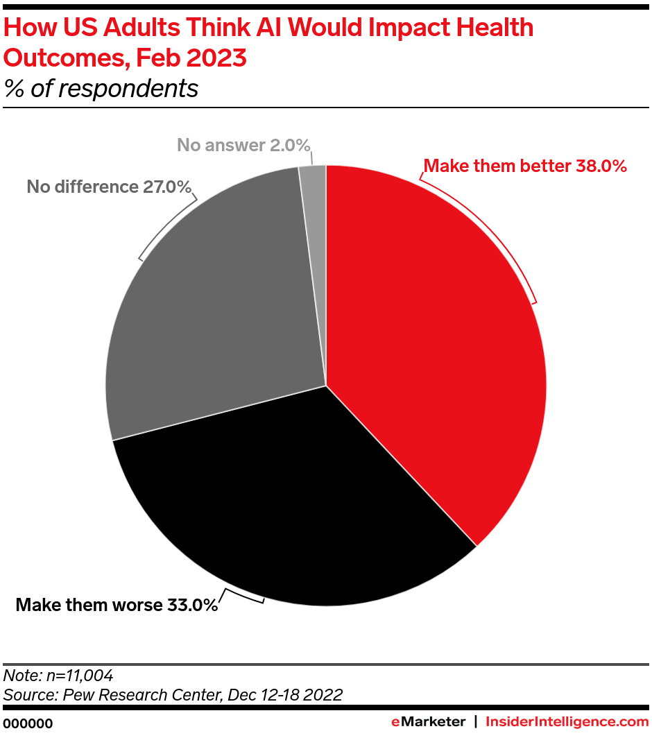 - 38% said AI being used for disease diagnosis and treatment recommendations would lead to better health outcomes for patients. 33% said it would lead to worse outcomes, and 27% say it wouldn’t make much difference.