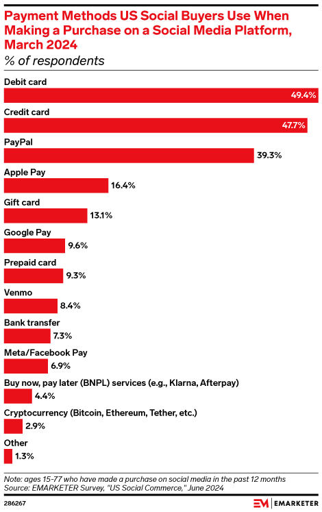 The payment options retailers offer at checkout can make or break these sales. Sixty-three percent of consumers strongly agree that paying with their preferred payment method is the most significant factor when completing a purchase, per a Q1 2024 Discover study. Here are three charts based on exclusive survey data that reveal how social buyers pay.