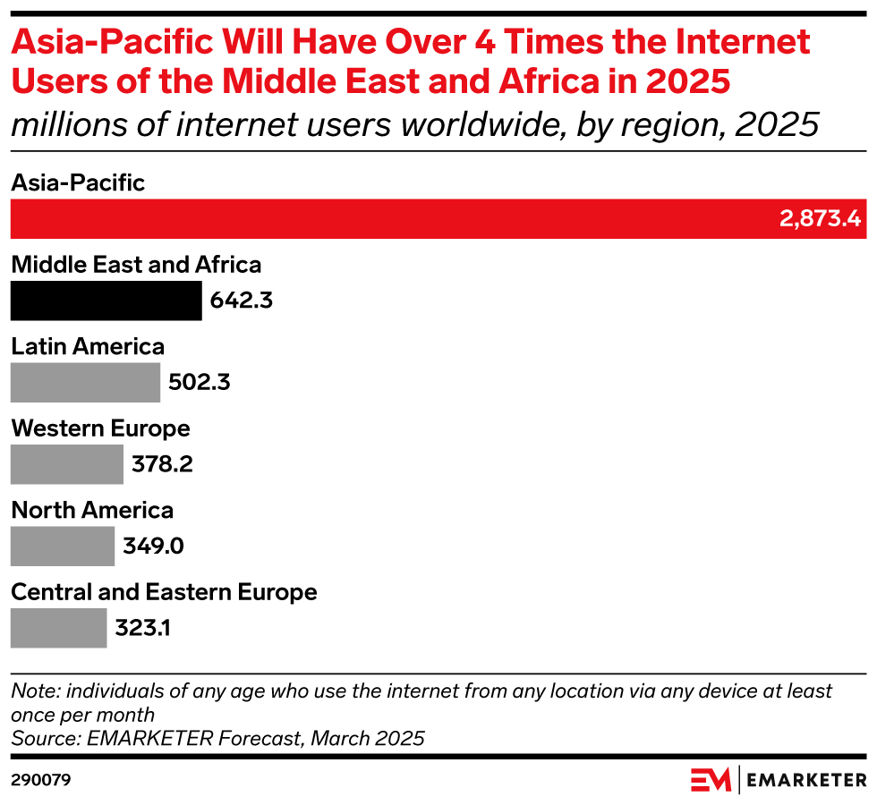 In 2025, the online population of Asia-Pacific will reach 2.87 billion, which is more than four times that of the second-placing region, the Middle East and Africa. Growth in Asia-Pacific is driven by countries like India and Indonesia, which have huge populations and relatively low internet user penetration at 54.8% and 66.5% of the populace, respectively.