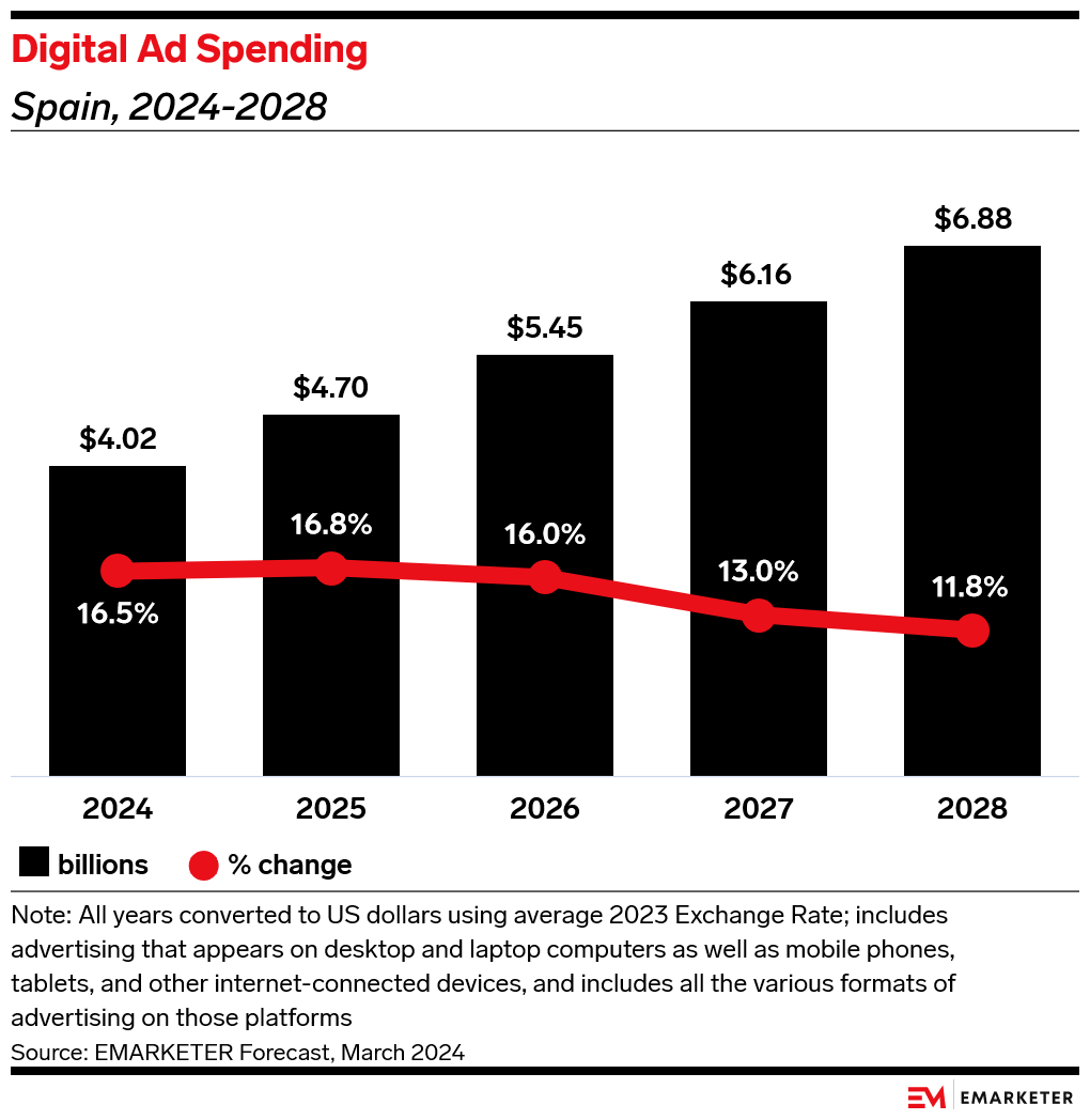Digital ad spending in Spain is on track for robust growth from 2024 to 2028, per our forecast, demonstrating a clear market shift. The progression begins at $4.02 billion in 2024, which represents a 16.5% YoY increase. By 2028, spending will reach $6.88 billion, with YoY growth decelerating to 11.8%.