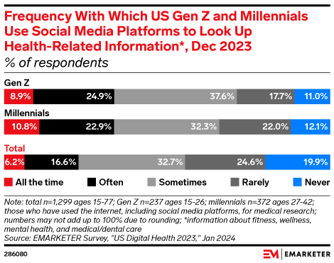 Younger consumers are increasingly turning to a variety of social media platforms and influencers to look up health-related information. Understanding how they’re using these platforms will help healthcare and pharmaceutical marketers reach more young patients. Here are four charts that reveal Gen Zers’ and millennials’ social media habits when it comes to healthcare, based on data from our December 2023 US Digital Health survey of 1,391 US consumers.